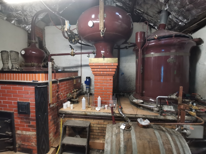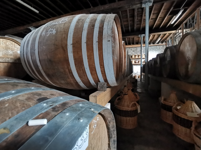 Nous voici donc arrivés dans le cru de Petite Champagne. Dans un bâtiment de l’exploitation, un petit alambic de 900 litres est en train de couler. Des échanges s’en suivent au sujet de la vigne, des cépages, des rendements, de la technique de distillation… Quelques minutes se passent ainsi, avant que Guilhem ne convainque le producteur d’aller visiter le chai.