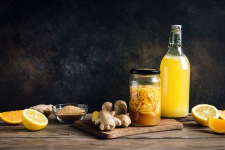 Versez 170g de gingembre haché, 100g de sucre, 20cl de jus de citron vert, 4 grammes de levure du boulanger et 1 litre d’eau.