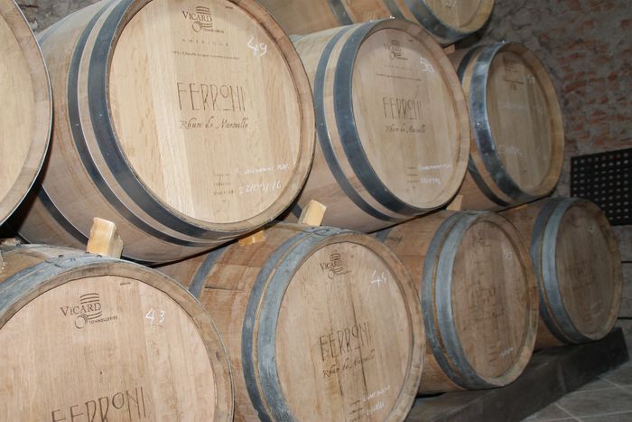 On travaille en liaison étroite avec la coopérative de Beaumes de Venise, donc on récupère les fûts de muscats les plus vieillis, de leur série des « Bois Dorés »”.