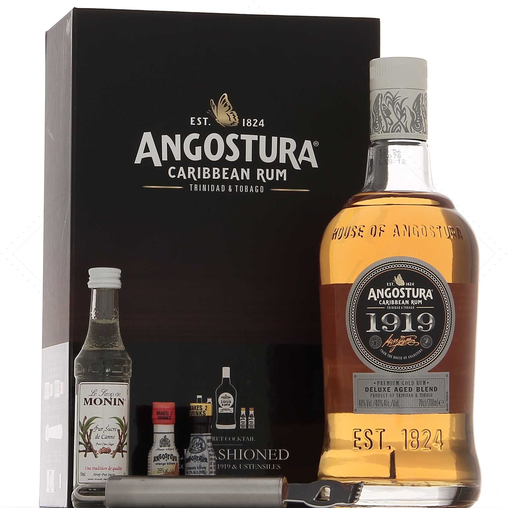 Angostura 1919 est ici accompagné d’ingrédients et d’un accessoire permettant la préparation du “old fashioned” : 2 mini bitter de chez Angostura (2 sorte différentes : le “classique”, et le “orange”), du sirop de canne à sucre et un zesteur d’agrume.