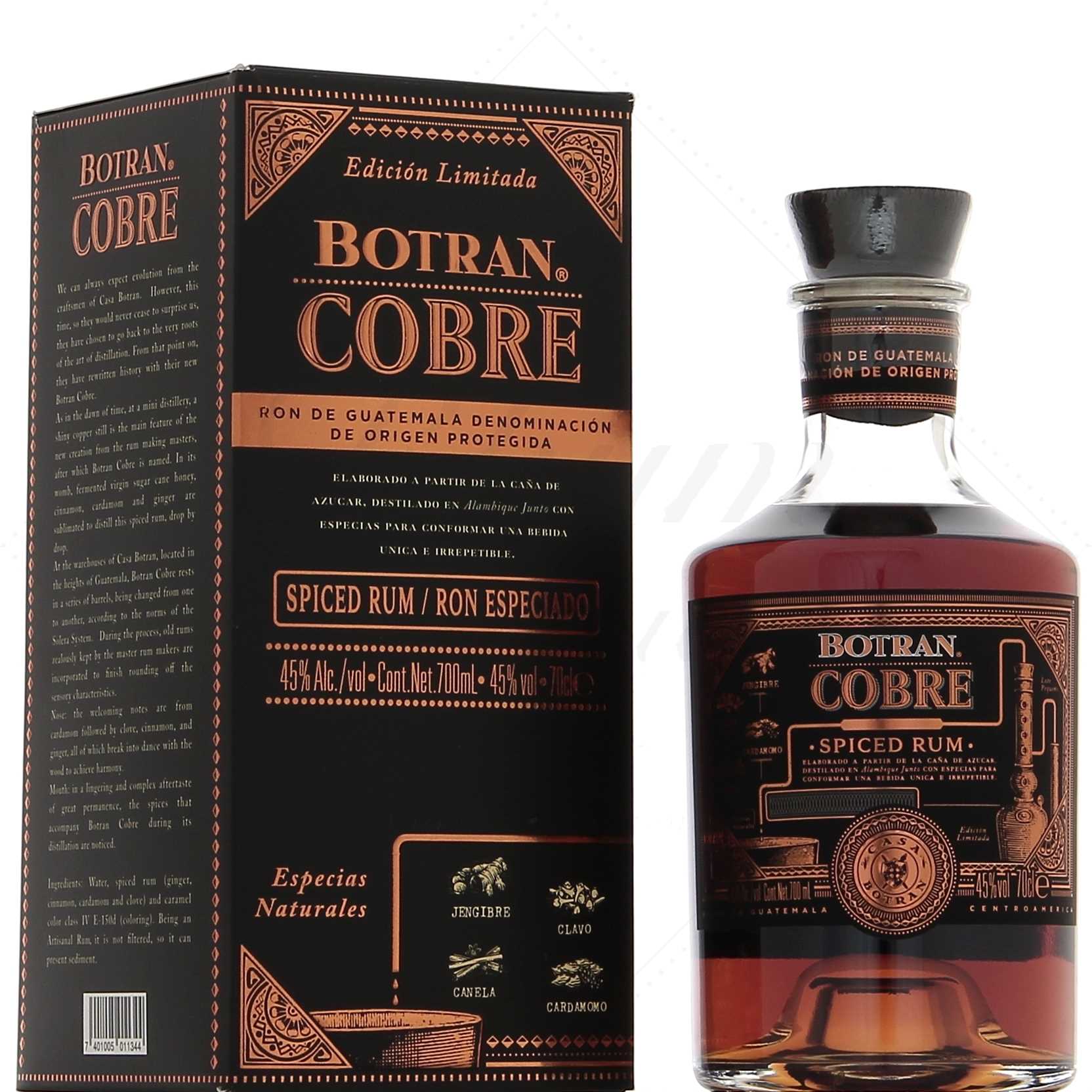 Botran Cobre est un rhum réalisé à partir de miel de canne et distillé dans un alambic en cuivre en présence de 4 épices différentes (girofle, gingembre, cannelle, cardamome). C’est de là qu’il tire son nom “Cobre” qui signifie “cuivre” en espagnol.