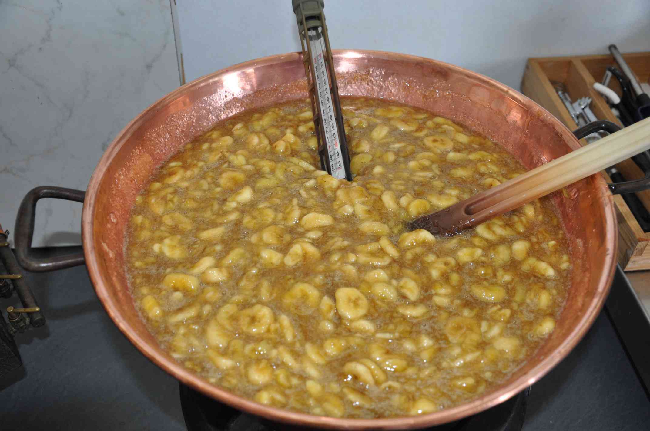 Élaborée dans une toute petite entreprise artisanale, cette confiture ananas/passion/rhum vieux est cuite dans un petit chaudron à feu extrêmement doux pendant 24 heures avec environ 1/2 bouteille de rhum vieux. Le rhum utilisé est un rhum martiniquais qui n’est pas toujours le même d’une production à l’autre (c’est pour cela que la marque n’est pas mentionnée sur l’étiquette). Lorsque nous avons goûté il s’agissait de rhum vieux Depaz.