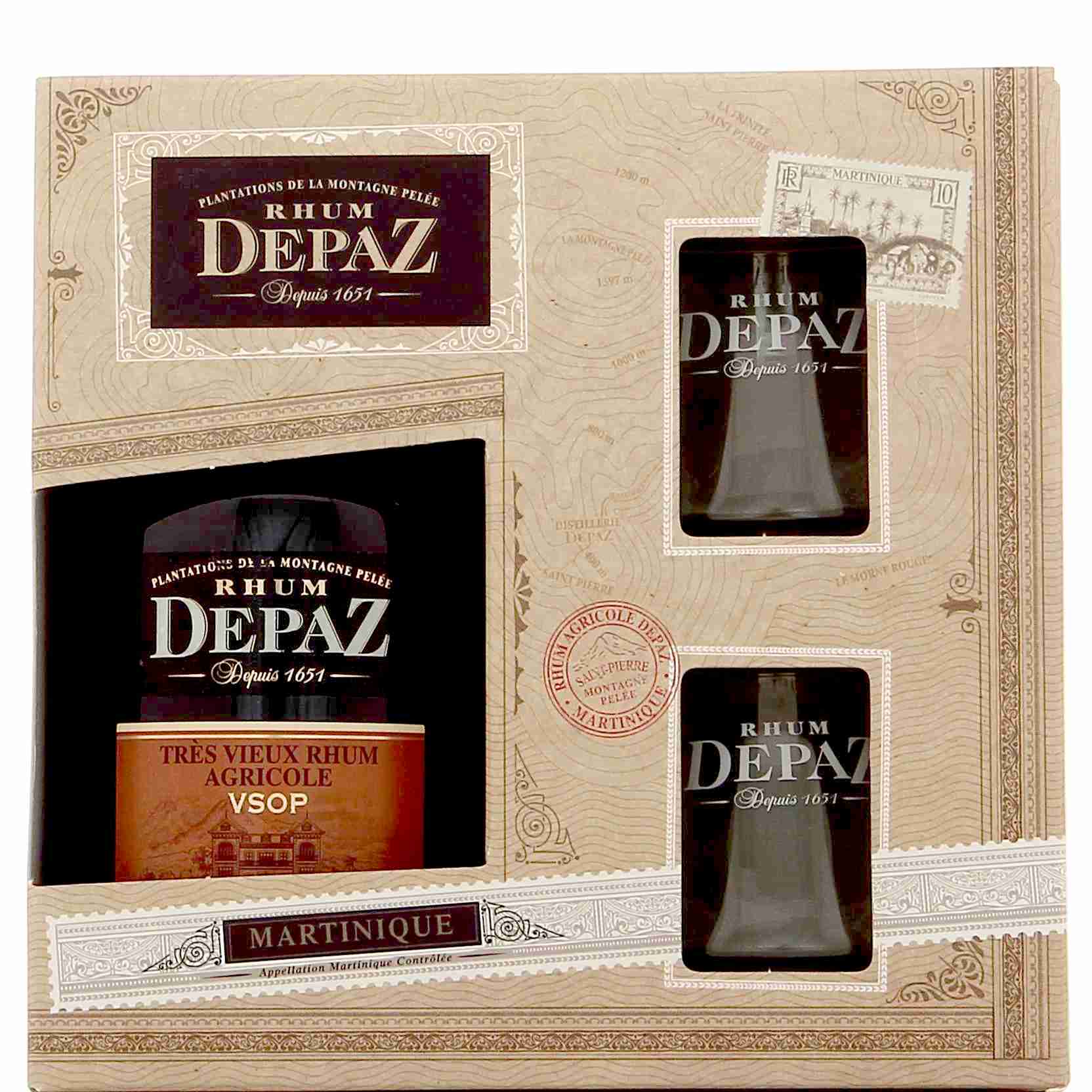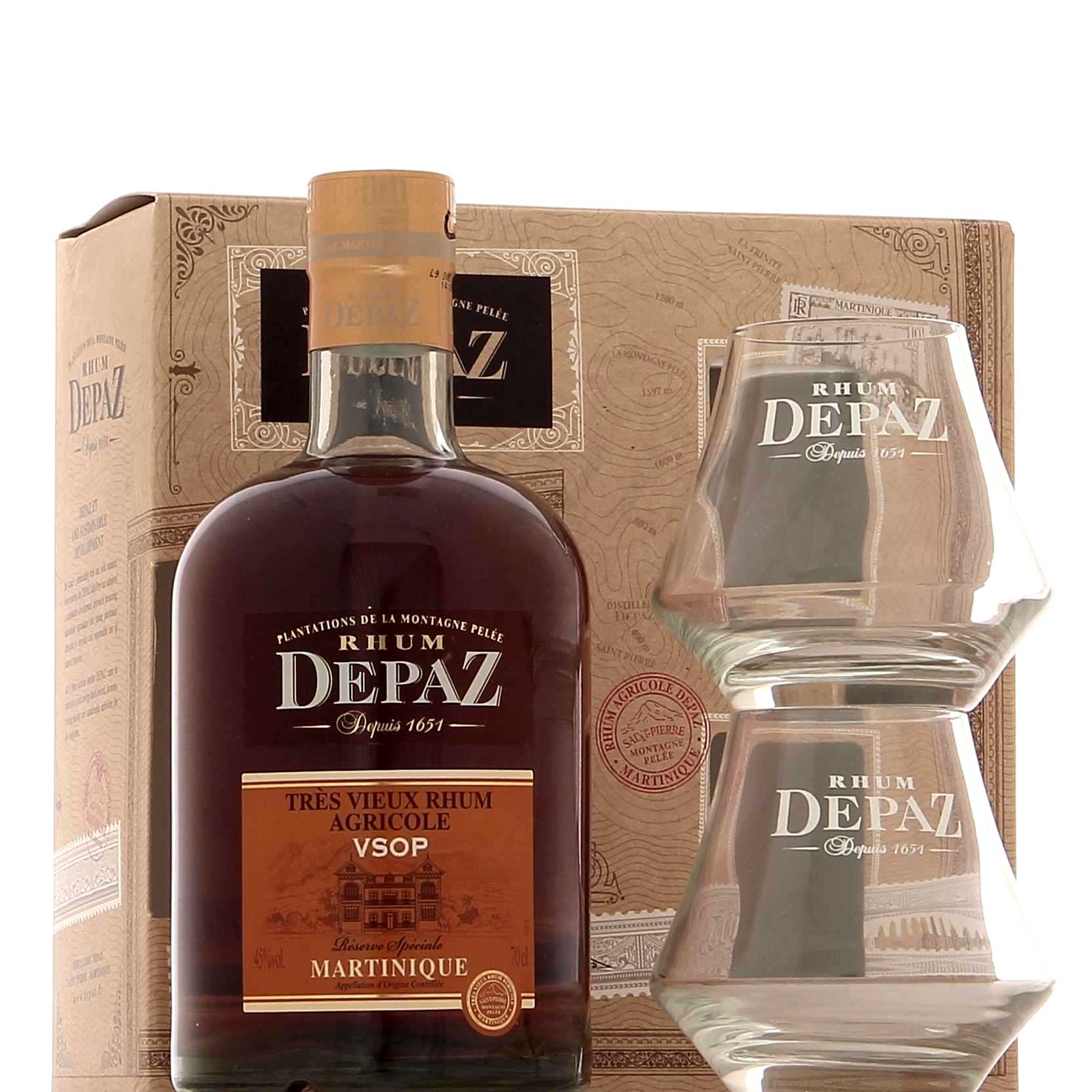Depaz VSOP est ici présenté dans un coffret avec 2 verres aux couleurs de la marque.