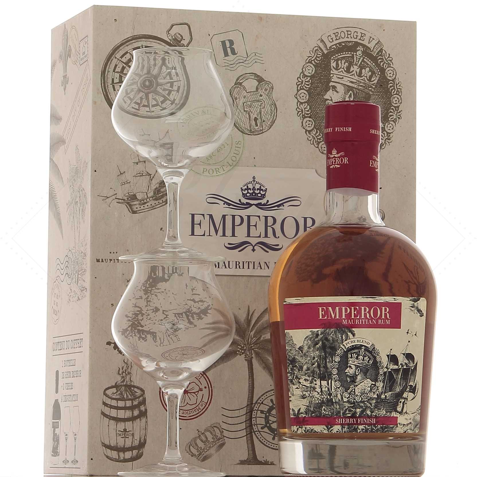 Le rhum de l’île Maurice Emperor Sherry Finish est ici présenté dans un coffret cadeau avec 2 verres de dégustation.