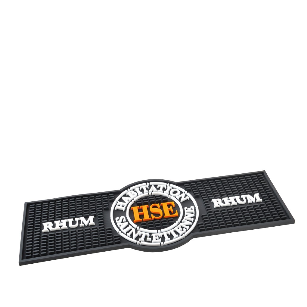 Accessoire indispensable pour des barmen, un tapis de bar adhérent de 15 centimètres de large estampillé du logo Habitation-Saint-Étienne.