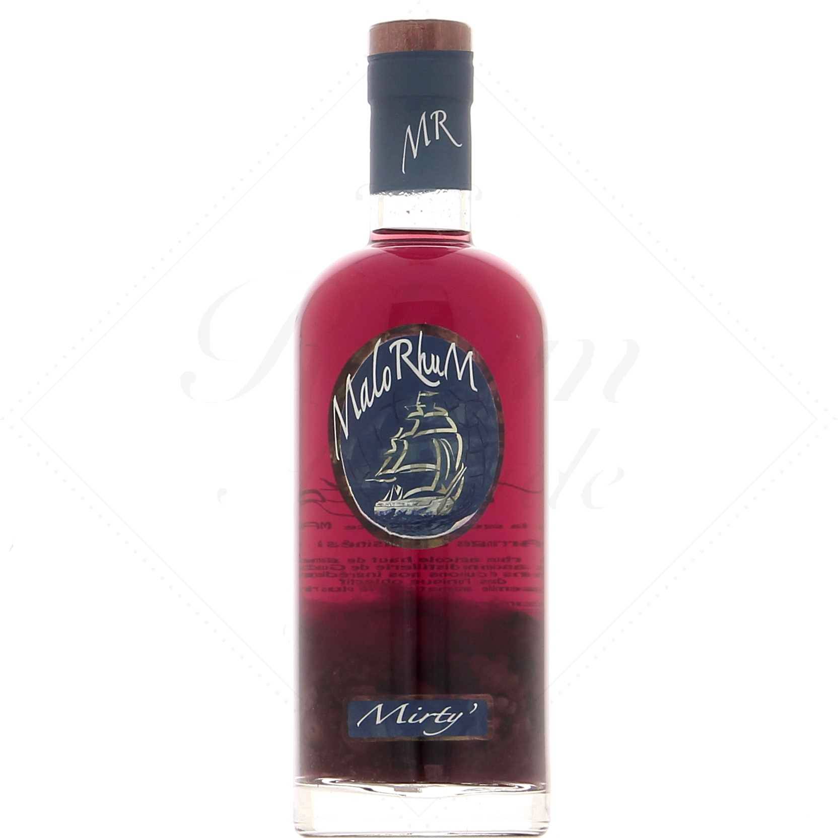 Malorhum Mirty est un rhum arrangé et cuisiné élaboré à partir de rhum agricole haut de gamme de Guadeloupe, de myrtilles, de framboises, de gingembre et autres épices. Les arômes et saveurs de chaque élément sont sublimés par la cuisson qui représente les 2/3 du temps de travail. Il n’y a pas de cuve de macération, chaque bouteille renferme sa propre macération d’une durée de 5 à 6 mois.