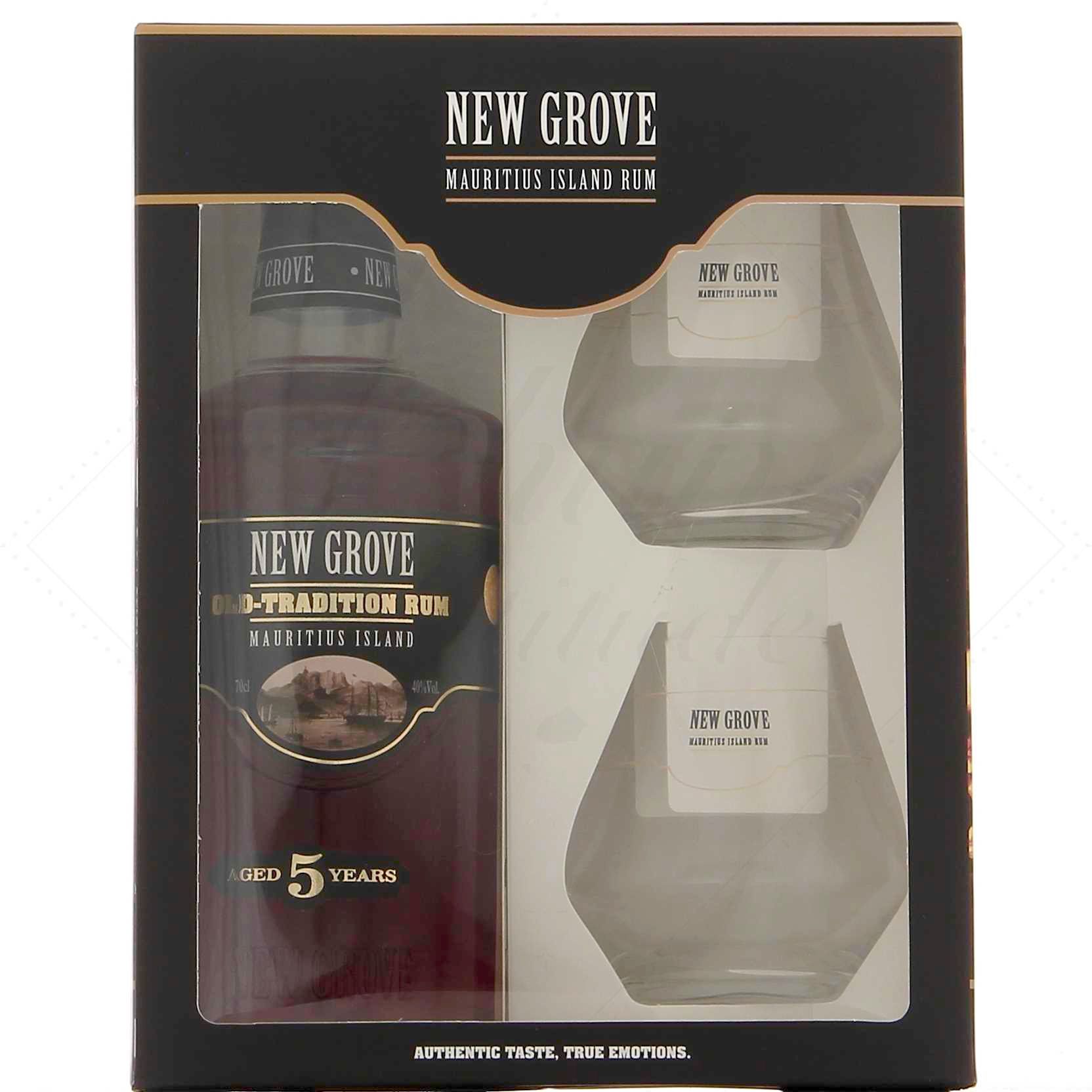 La bouteille est ici présentée dans un coffret avec 2 verres aux couleurs de la marque New Grove.