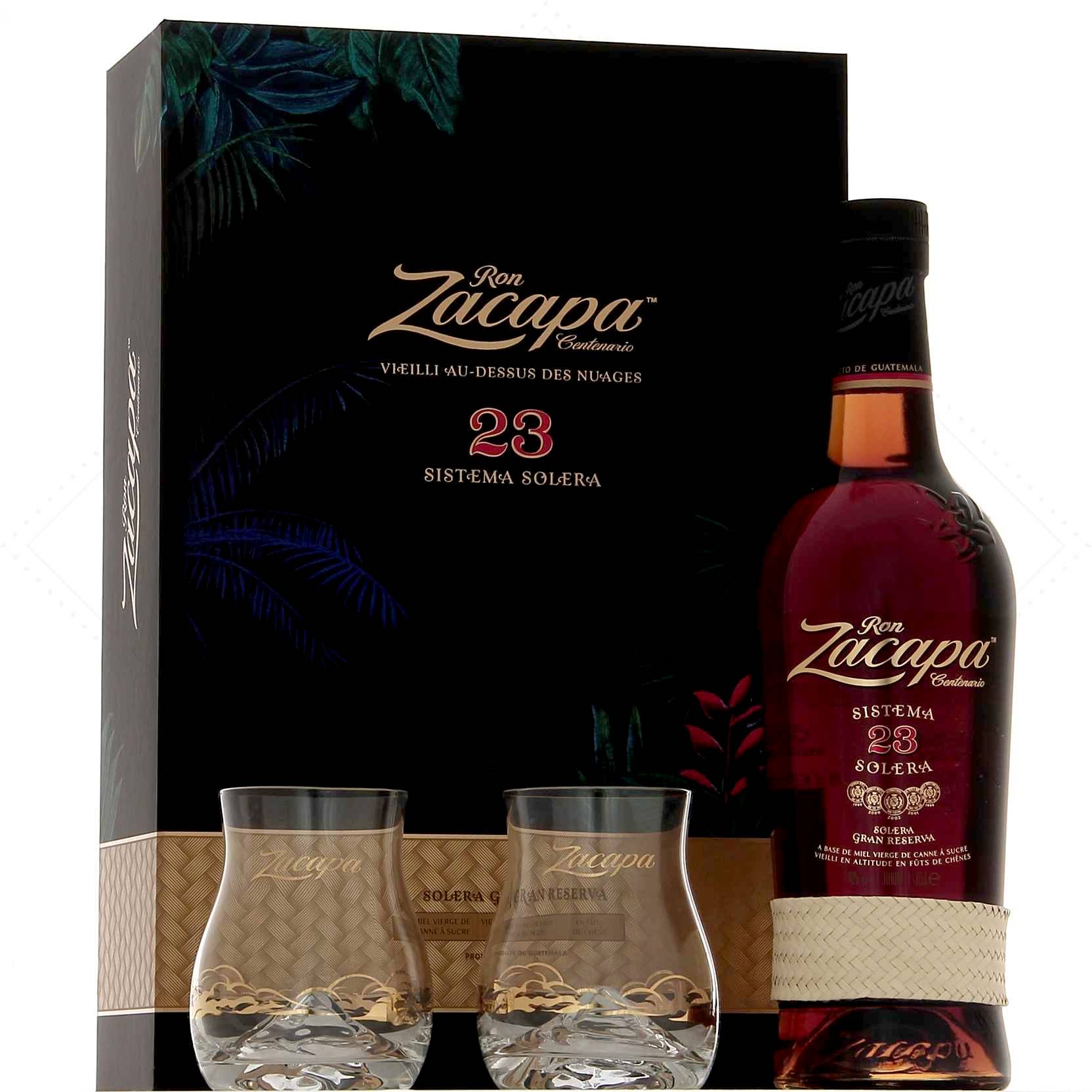Zacapa 23 est ici présenté dans un coffret contenant 2 verres sérigraphiés.